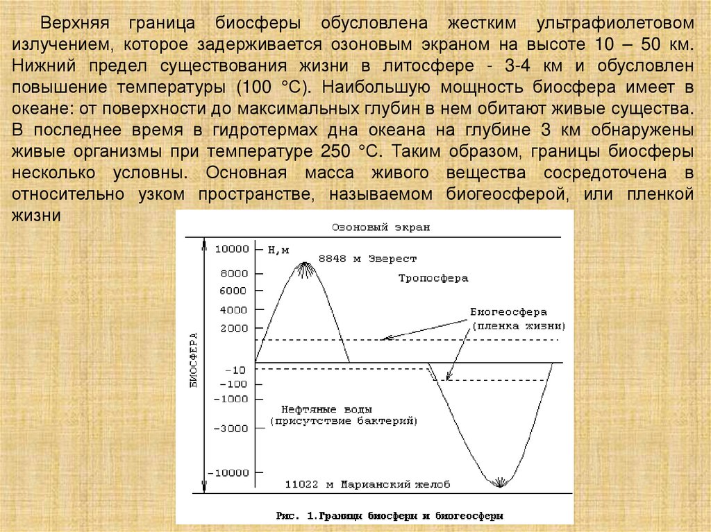 Верхняя граница биосферы обусловлена жестким ультрафиолетовомизлучением, которое задерживается озоновым экраном на высоте 10 – 50 км.