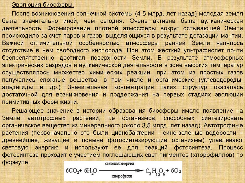 Эволюция биосферы.После возникновения солнечной системы (4-5 млрд. лет назад) молодая земля