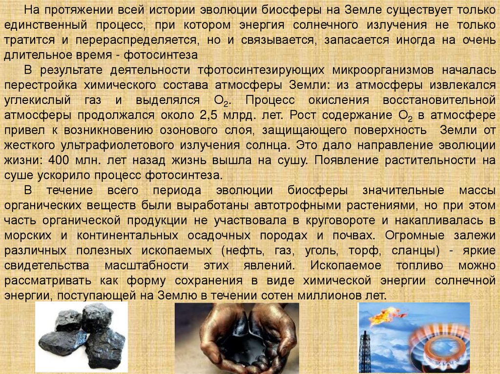 На протяжении всей истории эволюции биосферы на Земле существует толькоединственный процесс, при котором энергия солнечного излучения не только