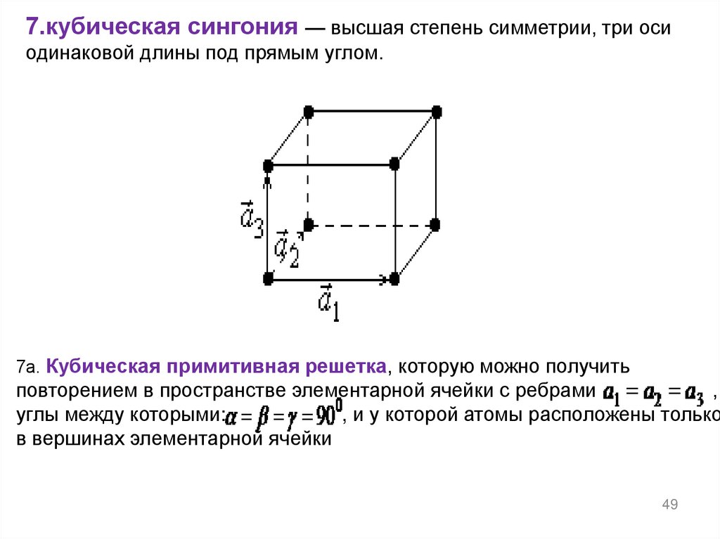 7.кубическая сингония — высшая степень симметрии, три осиодинаковой длины под прямым углом.