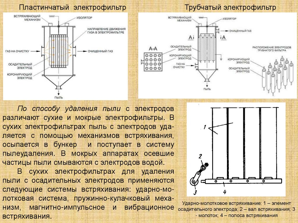 сухих электрофильтрах пыль с электродов удаляется с помощью механизмов встряхивания,