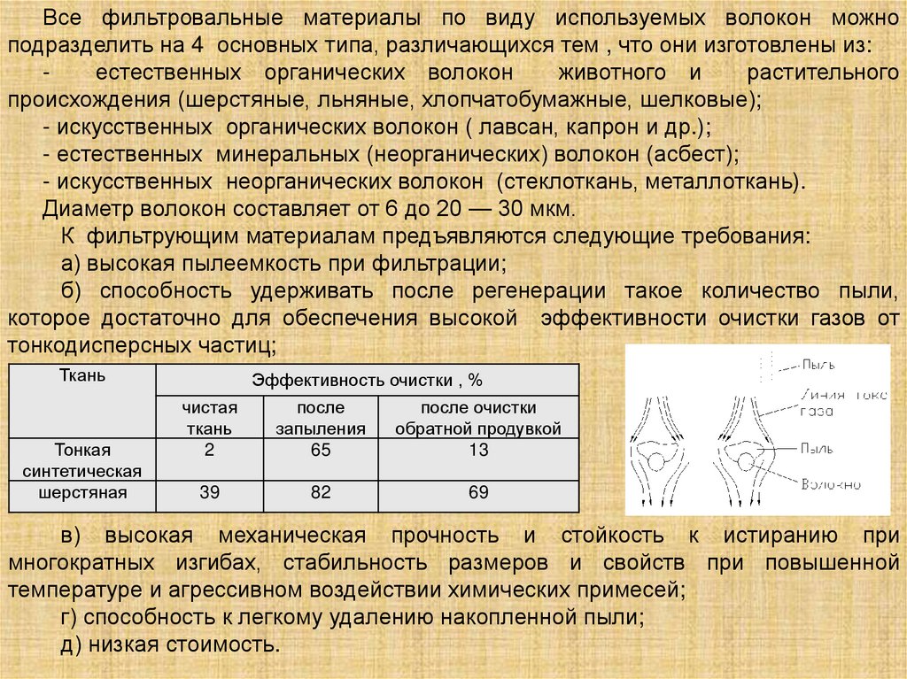 К фильтрующим материалам предъявляются следующие требования: