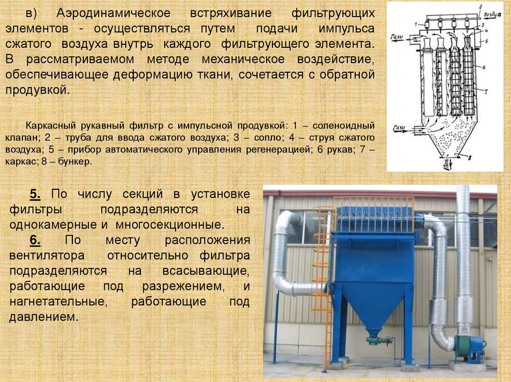 Каркасный рукавный фильтр с импульсной продувкой: 1 – соленоидный