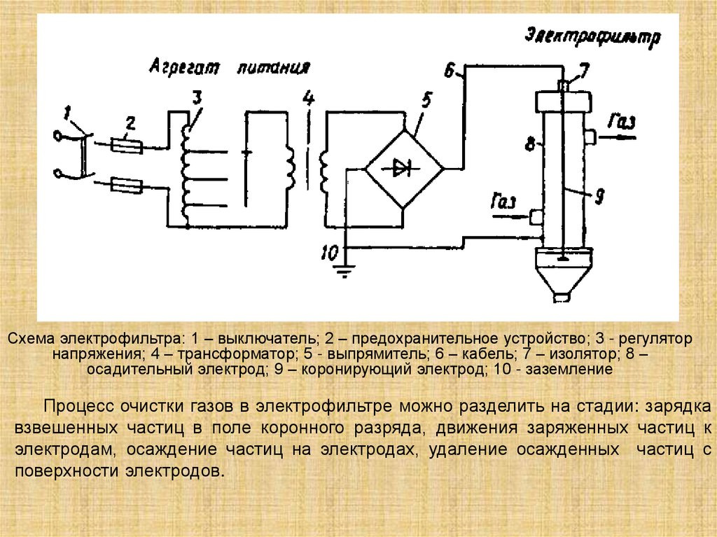 Схема электрофильтра: 1 – выключатель; 2 – предохранительное устройство; 3 - регуляторнапряжения; 4 – трансформатор; 5 - выпрямитель; 6 – кабель; 7 – изолятор; 8 –