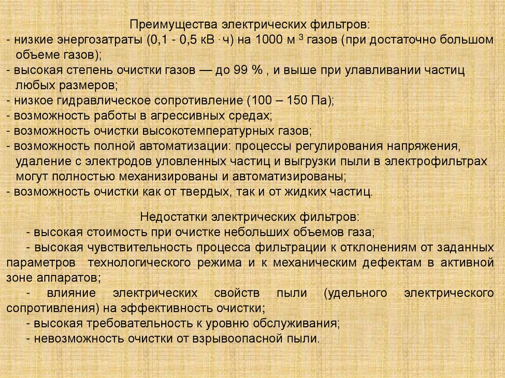 Преимущества электрических фильтров:- низкие энергозатраты (0,1 - 0,5 кВ . ч) на 1000 м 3 газов (при достаточно большом