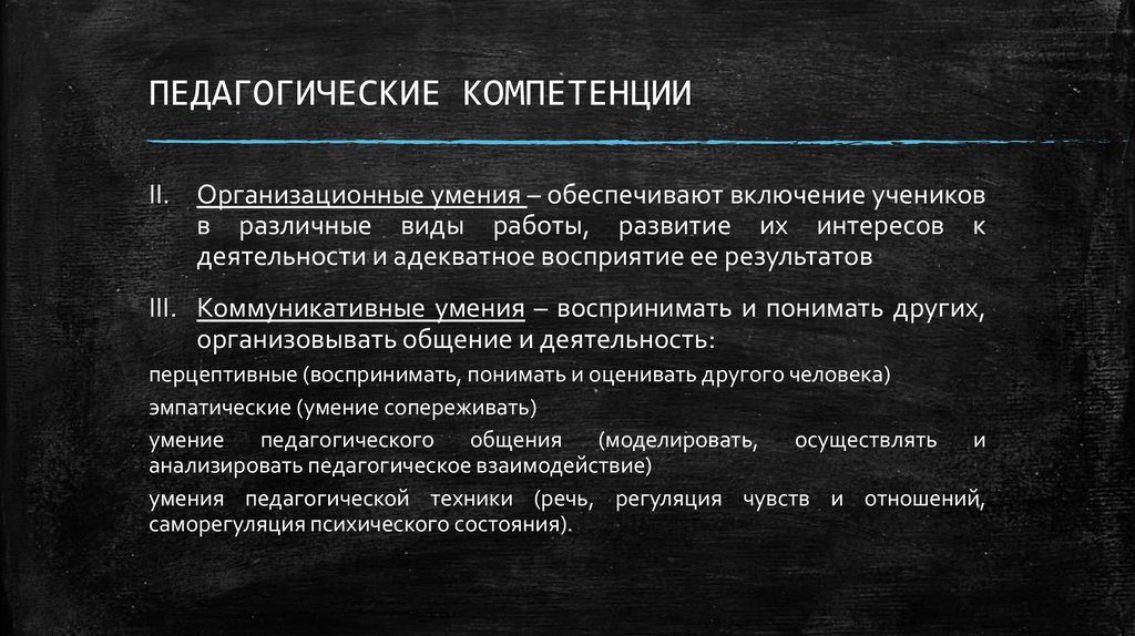 ПЕДАГОГИЧЕСКИЕ КОМПЕТЕНЦИИII. Организационные умения – обеспечивают включение учеников