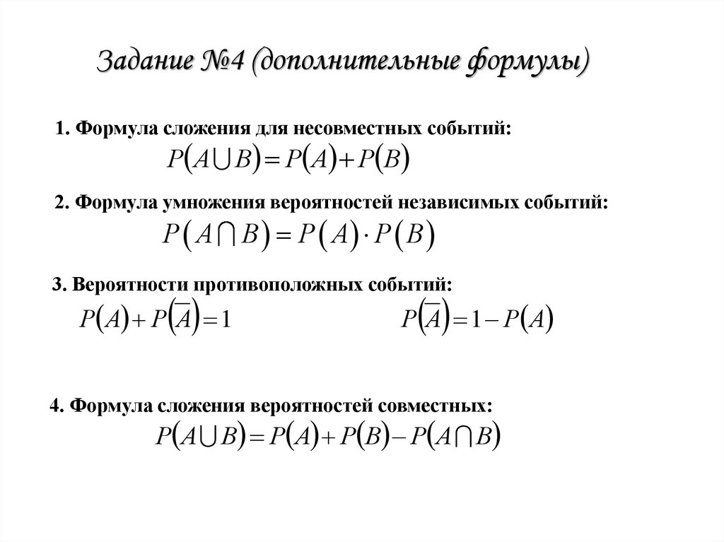 Задание №4 (дополнительные формулы)1. Формула сложения для несовместных событий:
