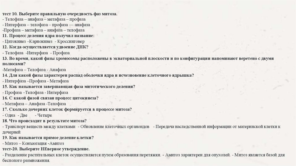 тест 10. Выберите правильную очередность фаз митоза.- Телофаза – анафаза – метафаза – профаза