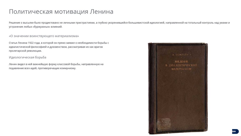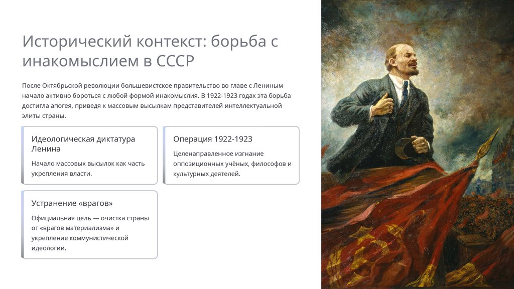 Политическая мотивация ЛенинаРешение о высылке было продиктовано не личными пристрастиями, а глубоко укоренившейся большевистской идеологией, направленной на тотальный контроль над умами и