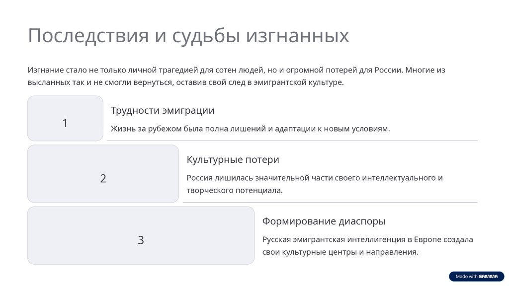 Последствия и судьбы изгнанныхИзгнание стало не только личной трагедией для сотен людей, но и огромной потерей для России. Многие из