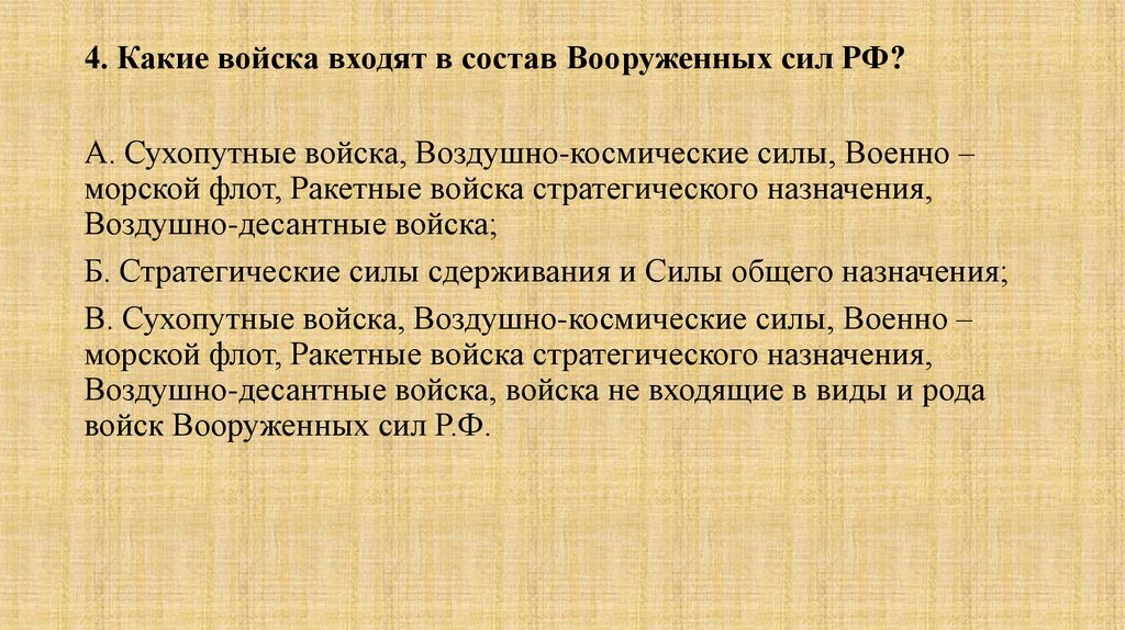 4. Какие войска входят в состав Вооруженных сил РФ?А. Сухопутные войска, Воздушно-космические силы, Военно –
