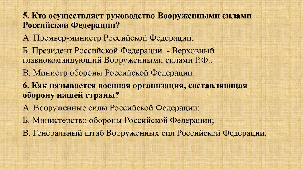 5. Кто осуществляет руководство Вооруженными силамиРоссийской Федерации?