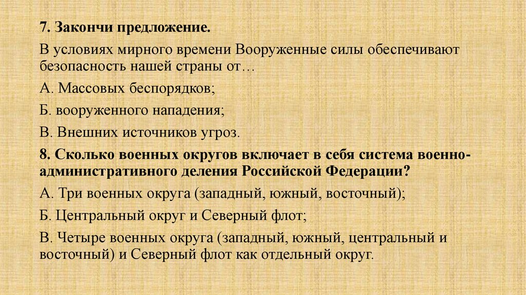 7. Закончи предложение.В условиях мирного времени Вооруженные силы обеспечивают