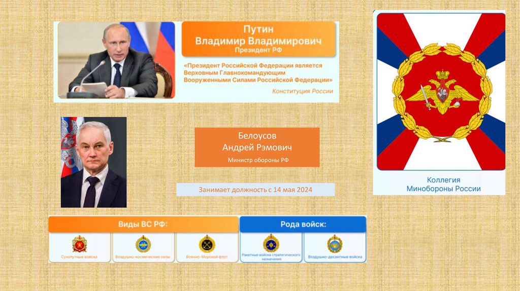 • центральные органы военного управления;• виды войск Вооруженных сил (Сухопутные войска, Воздушнокосмические силы, Военно-морской флот);