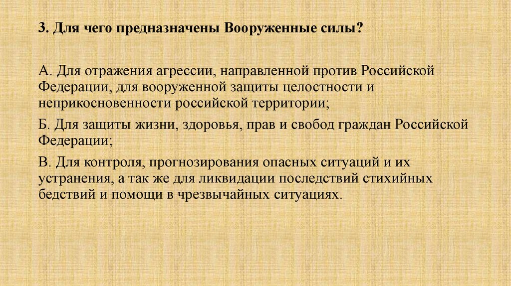 3. Для чего предназначены Вооруженные силы?А. Для отражения агрессии, направленной против Российской