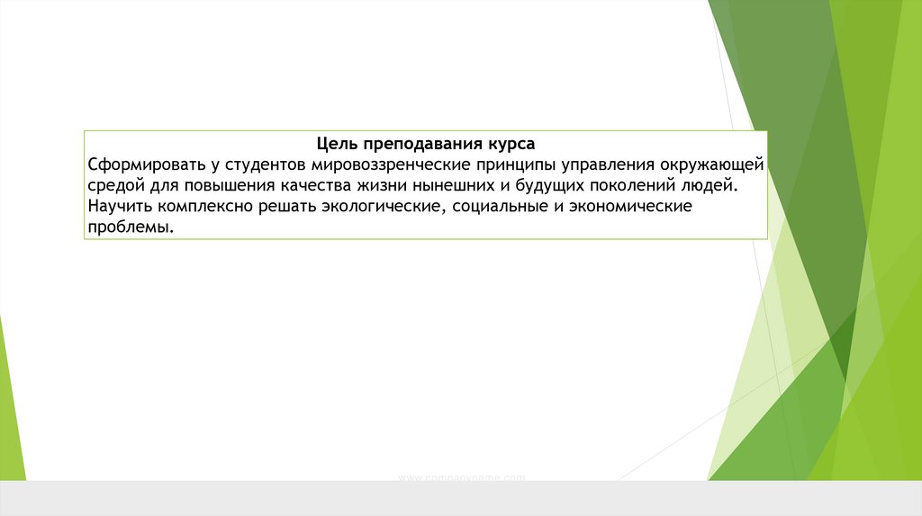 Цель преподавания курсаСформировать у студентов мировоззренческие принципы управления окружающей