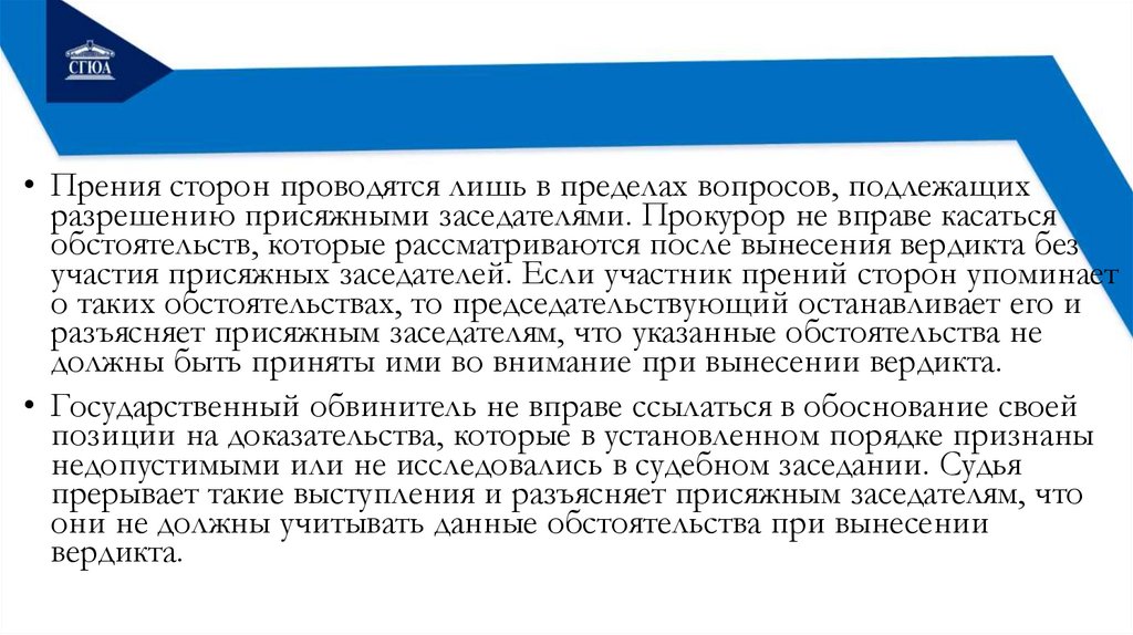 • Прения сторон проводятся лишь в пределах вопросов, подлежащихразрешению присяжными заседателями. Прокурор не вправе касаться
