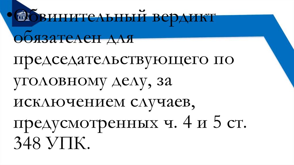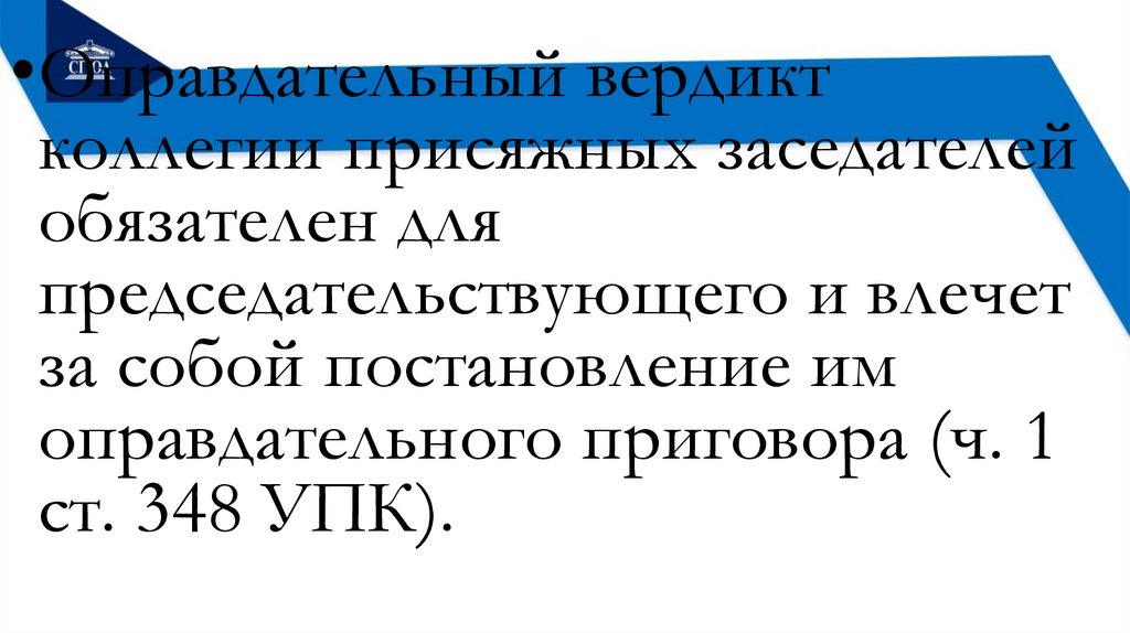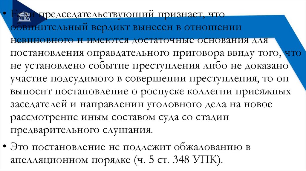 • Если председательствующий признает, чтообвинительный вердикт вынесен в отношении