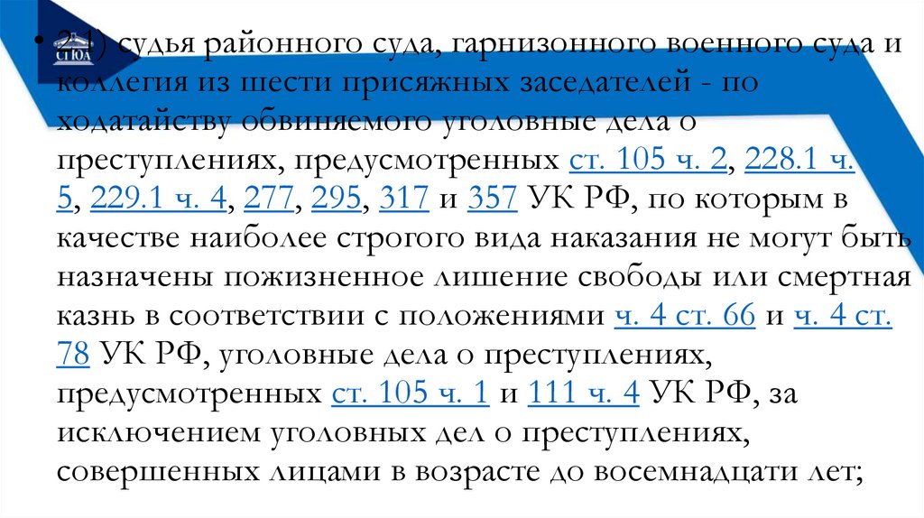 • 2.1) судья районного суда, гарнизонного военного суда иколлегия из шести присяжных заседателей - по