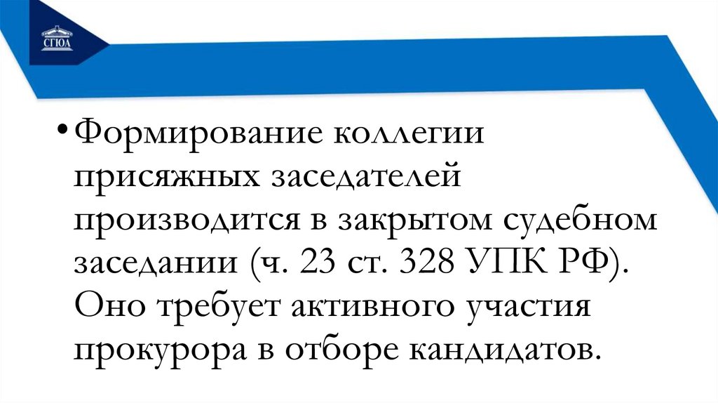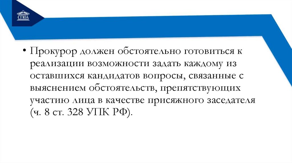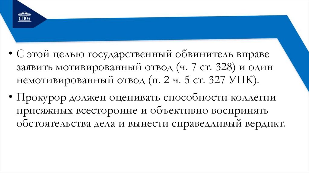 • С этой целью государственный обвинитель вправезаявить мотивированный отвод (ч. 7 ст. 328) и один