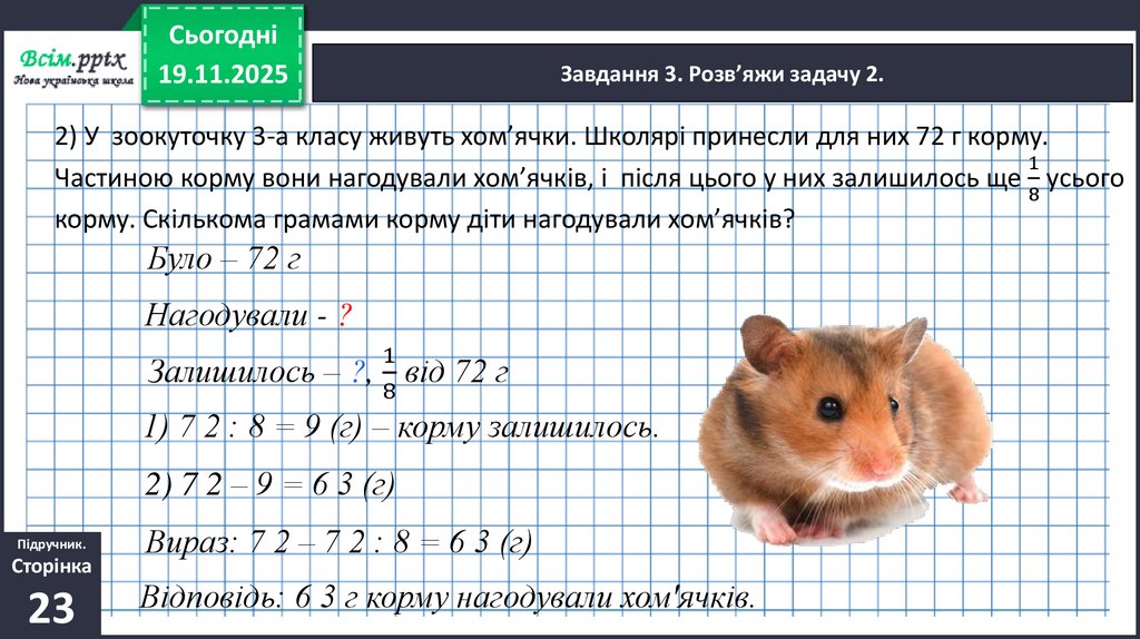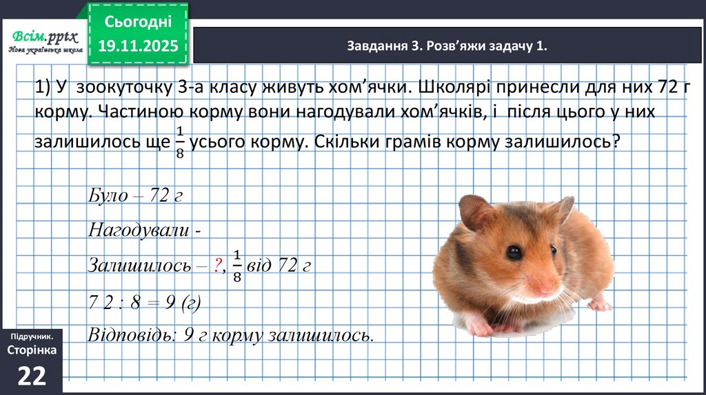 2) У зоокуточку 3-а класу живуть хом’ячки. Школярі принесли для них 72 г корму.