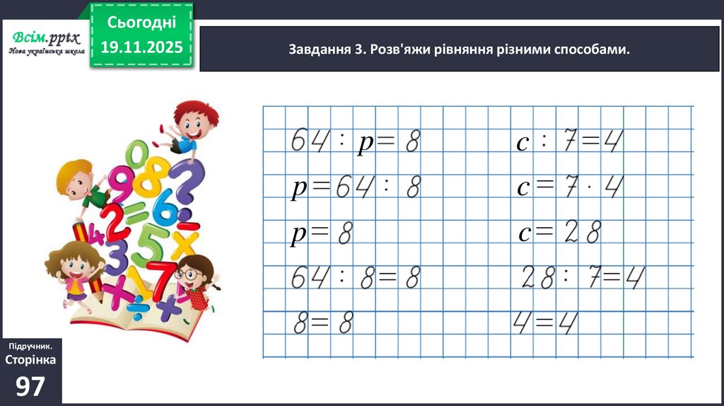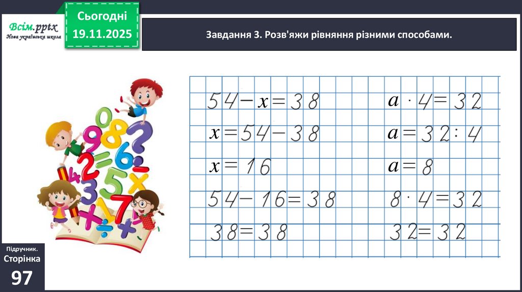розв'язання задачі 3? Добери опорну схему задачі 3 із поданих угорі с. 97.