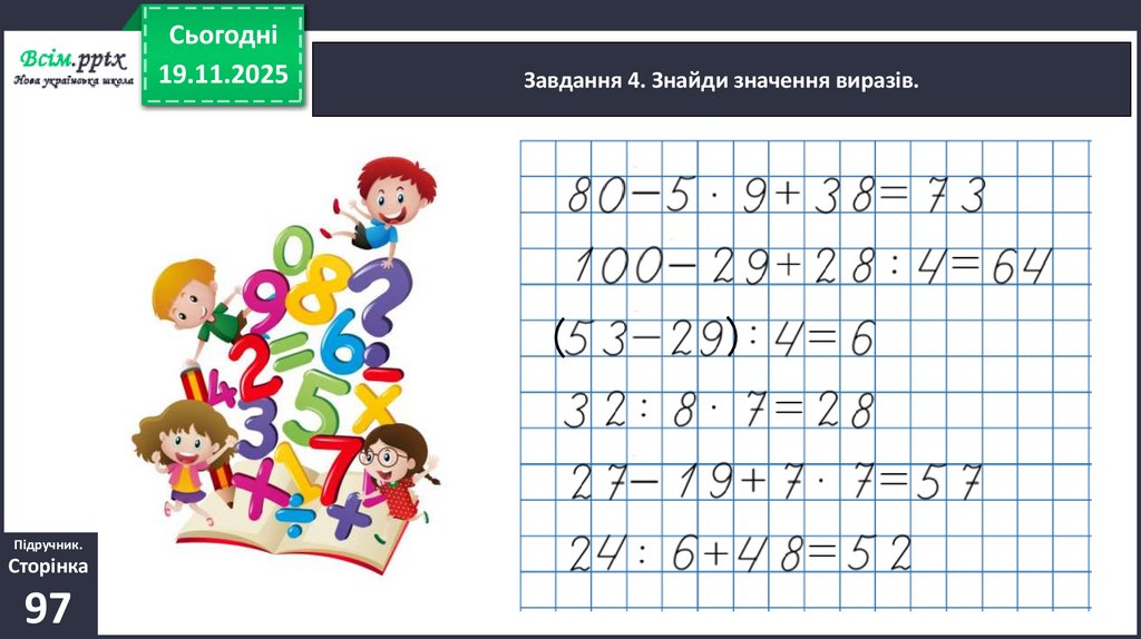 Вираз: 9 0 – 9 0 : 9 = 8 0 (грн)