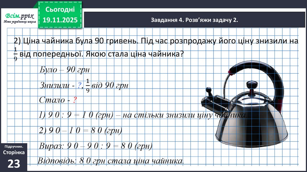 2) Ціна чайника була 90 гривень. Під час розпродажу його ціну знизили на