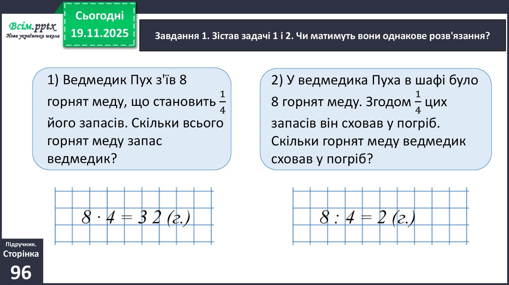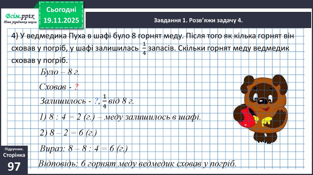 1) 8 : 4 = 2 (г.) – меду сховав ведмедик у погріб.