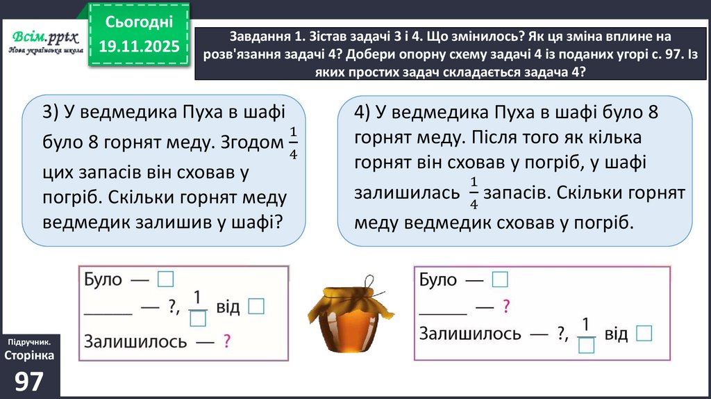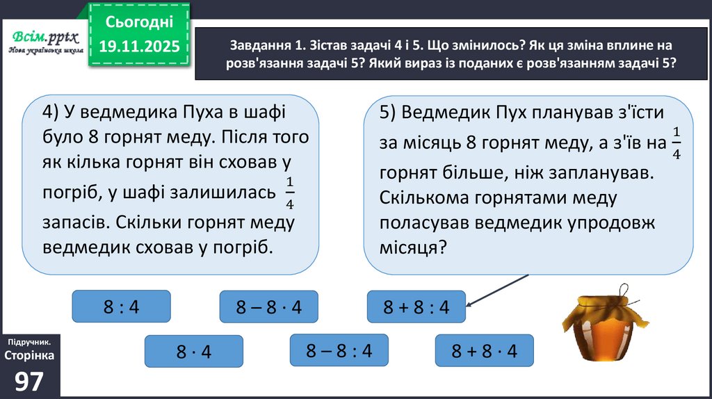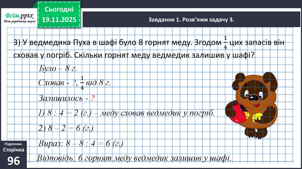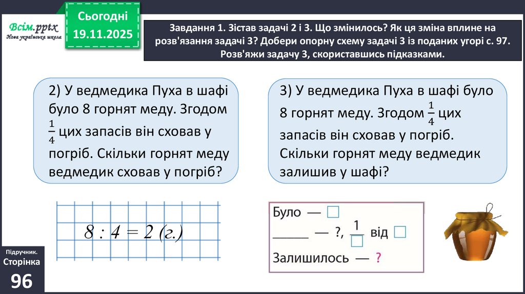 3) У ведмедика Пуха в шафі було 8 горнят меду. Згодом цих запасів він