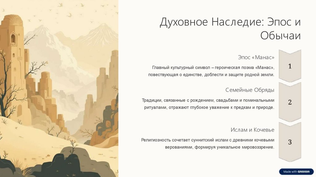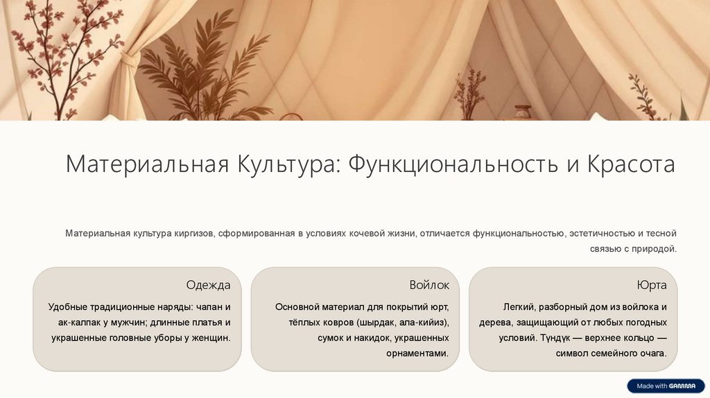 Материальная Культура: Функциональность и КрасотаМатериальная культура киргизов, сформированная в условиях кочевой жизни, отличается функциональностью, эстетичностью и тесной