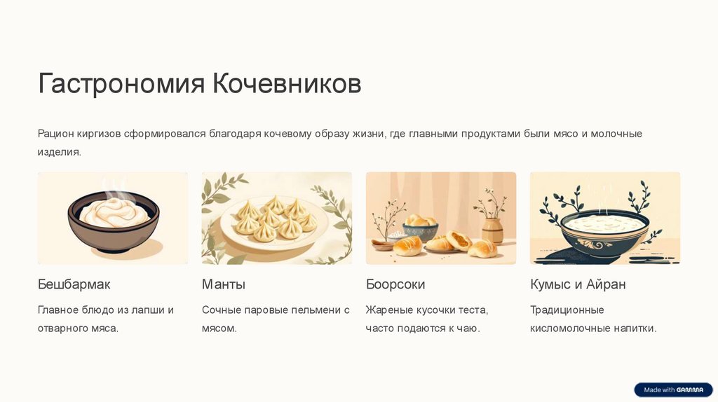 Гастрономия КочевниковРацион киргизов сформировался благодаря кочевому образу жизни, где главными продуктами были мясо и молочные