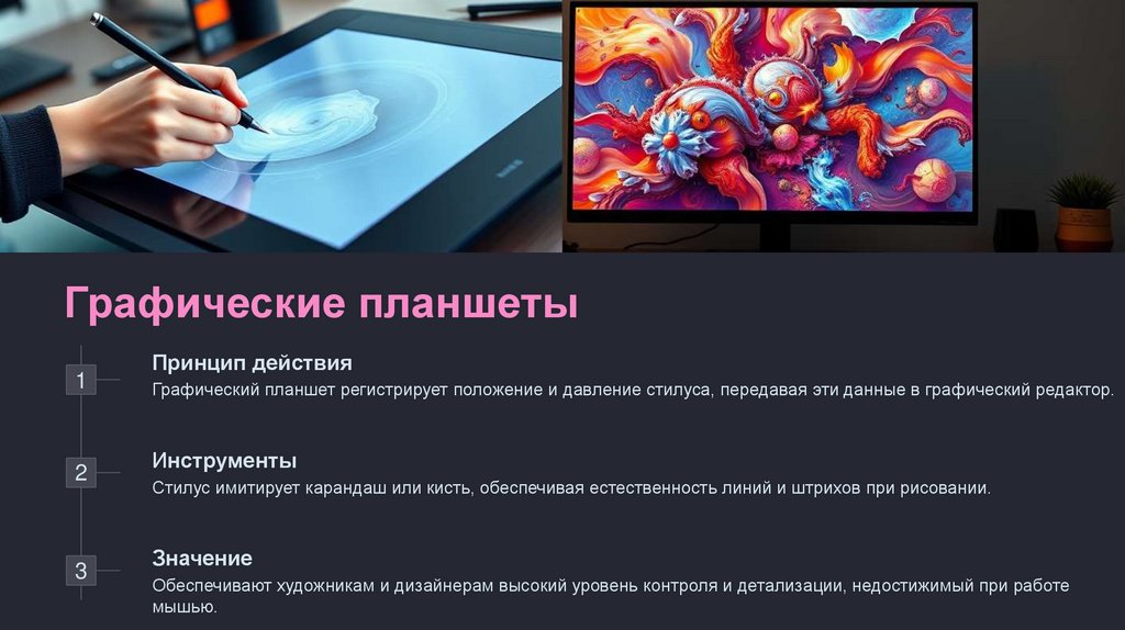 Графический планшет регистрирует положение и давление стилуса, передавая эти данные в графический редактор.