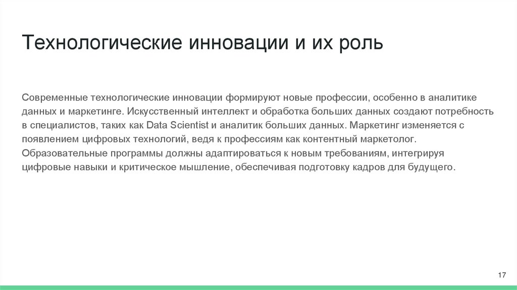 Технологические инновации и их рольСовременные технологические инновации формируют новые профессии, особенно в аналитике