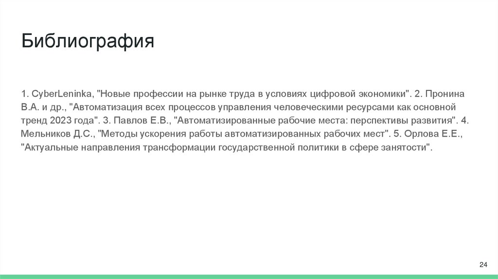 Библиография1. CyberLeninka, "Новые профессии на рынке труда в условиях цифровой экономики". 2. Пронина
