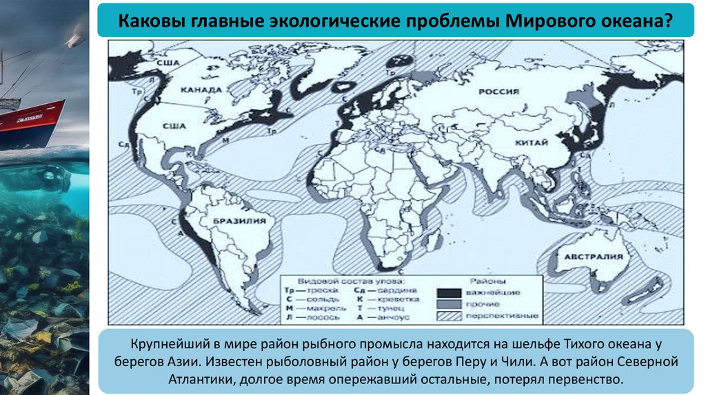 Каковы главные экологические проблемы Мирового океана?Крупнейший в мире район рыбного промысла находится на шельфе Тихого океана у