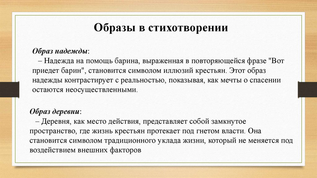 приедет барин", становится символом иллюзий крестьян. Этот образ