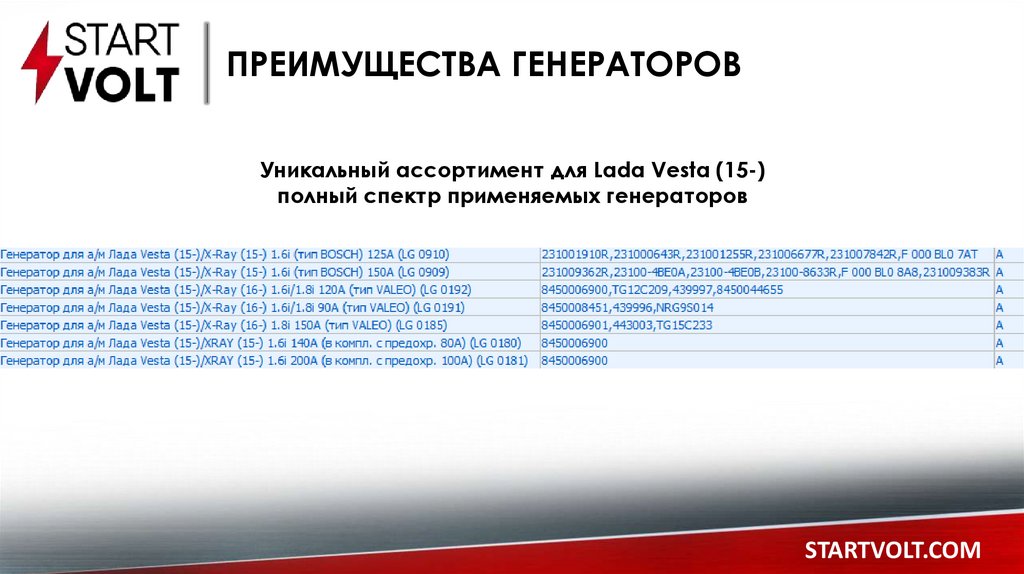 ПРЕИМУЩЕСТВА ГЕНЕРАТОРОВУникальный ассортимент для Lada Vesta (15-)