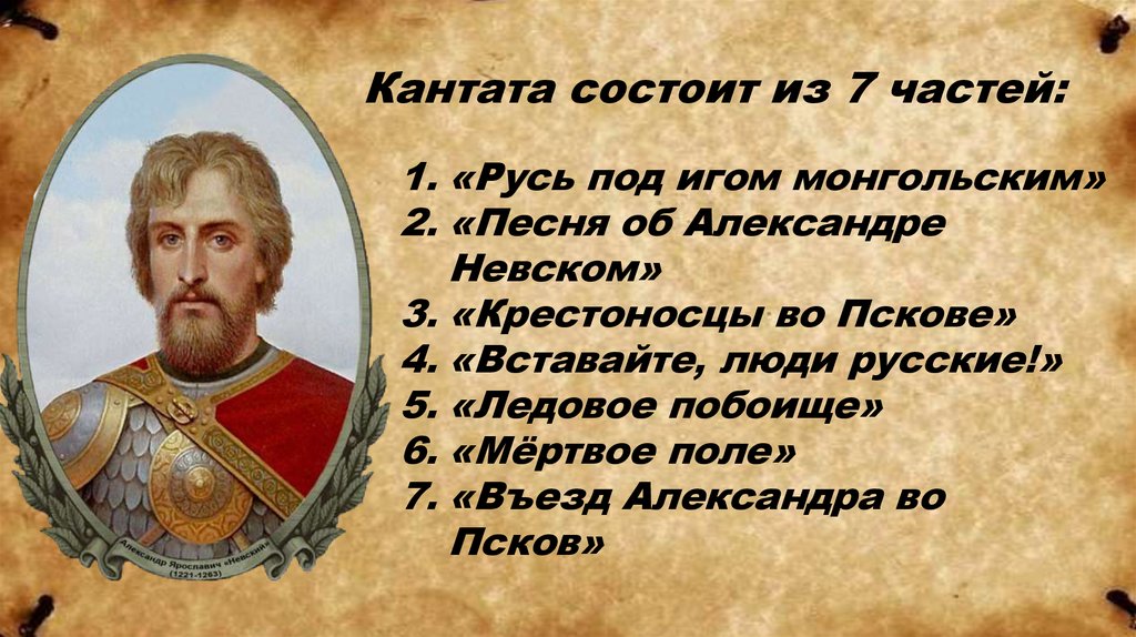 Кантата состоит из 7 частей:1. «Русь под игом монгольским»