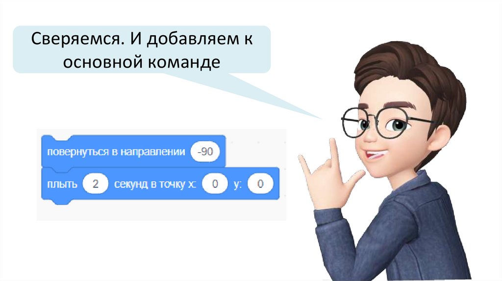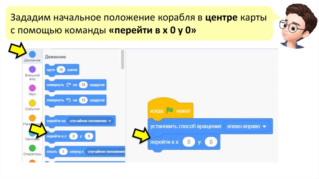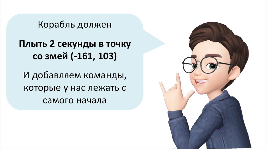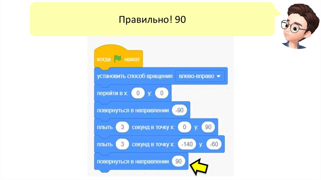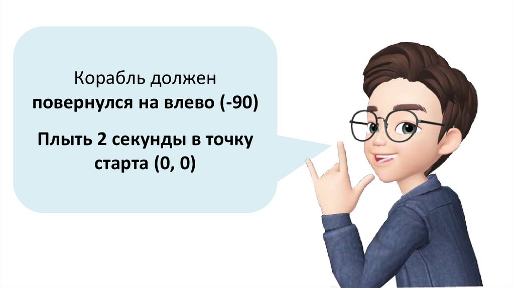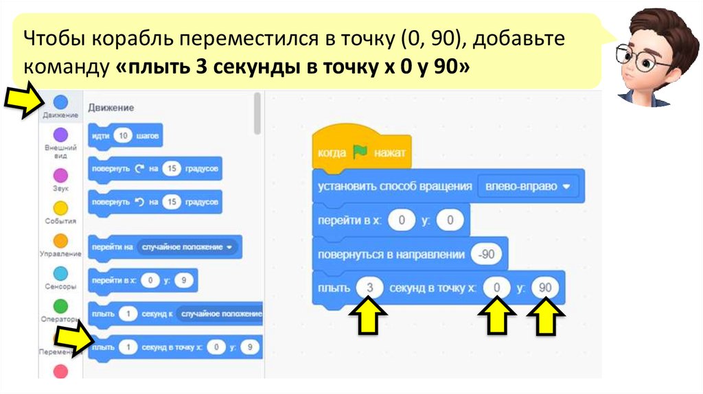 Чтобы корабль переместился в точку (0, 90), добавьтекоманду «плыть 3 секунды в точку х 0 у 90»