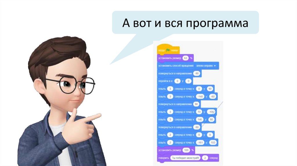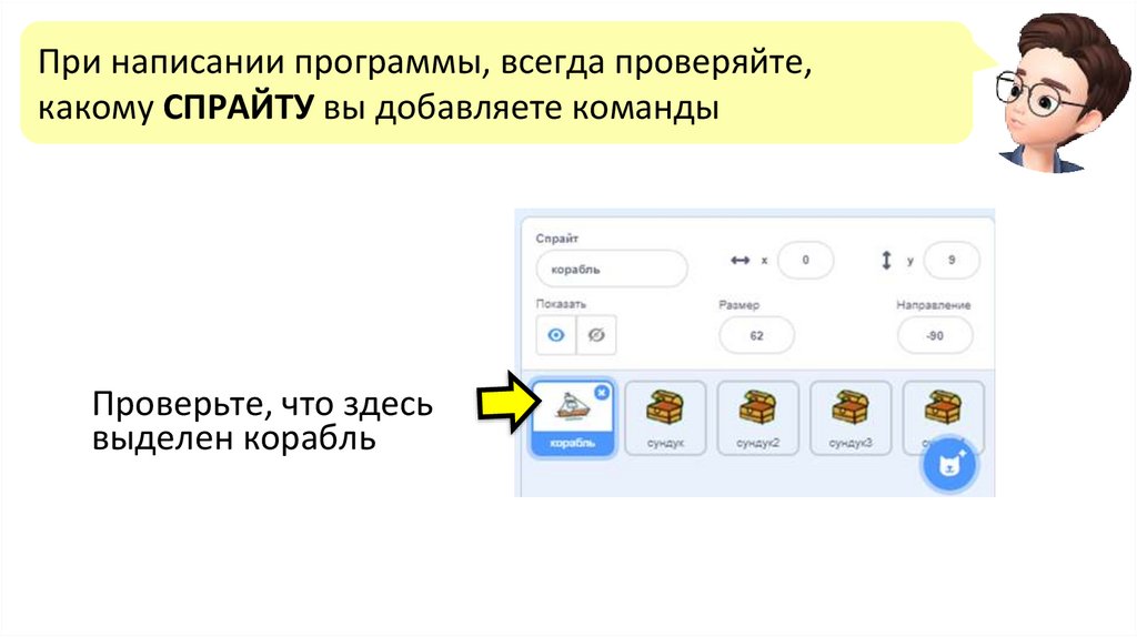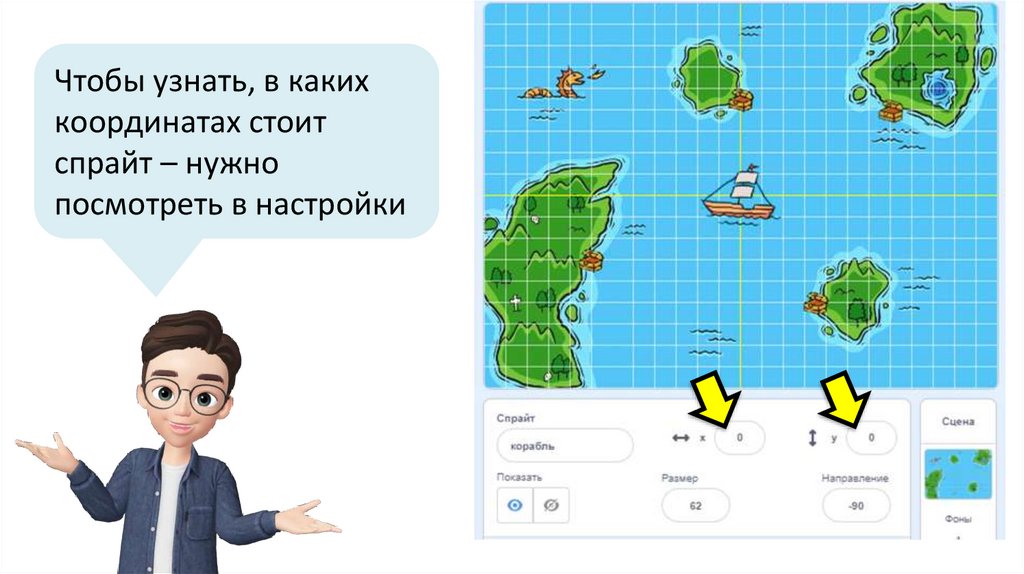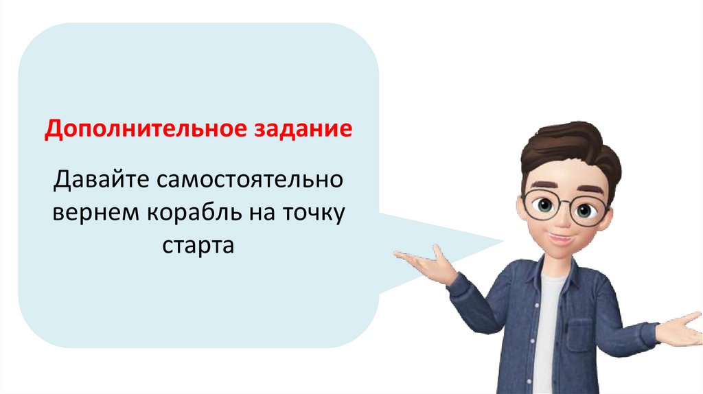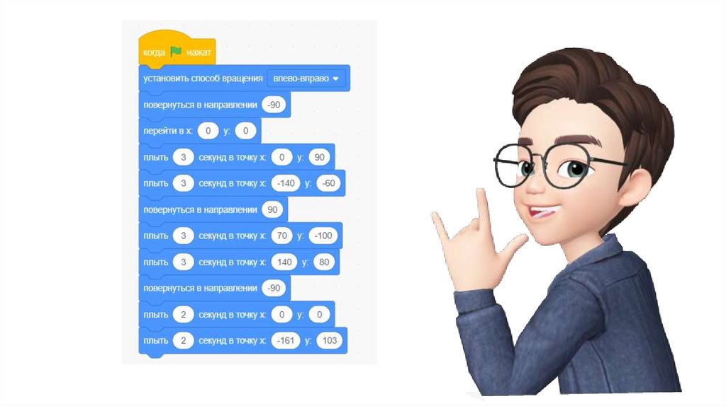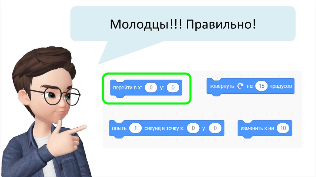 Чтобы корабль переместился в точку (0, 90), добавьтекоманду «плыть 3 секунды в точку х 0 у 90»