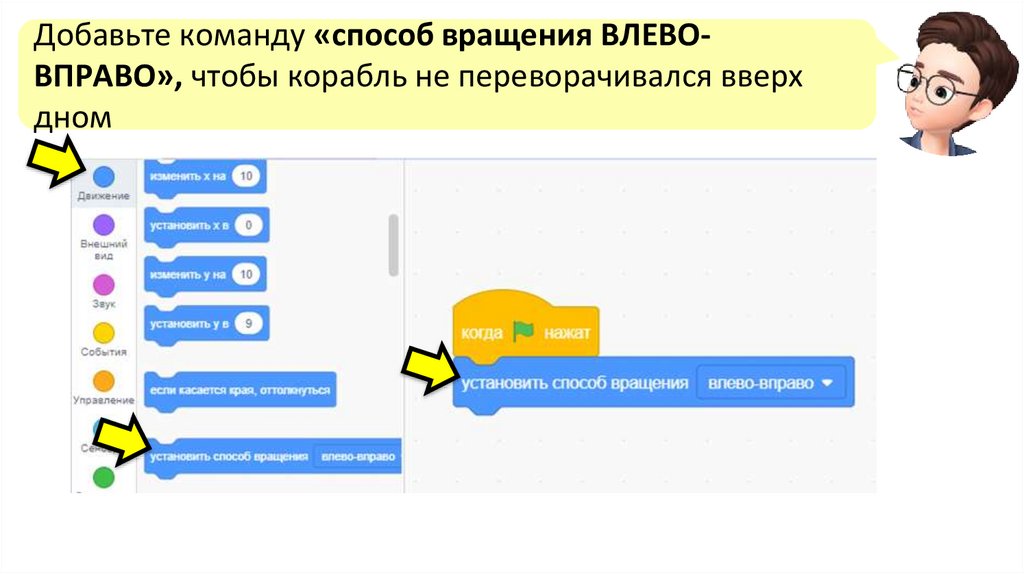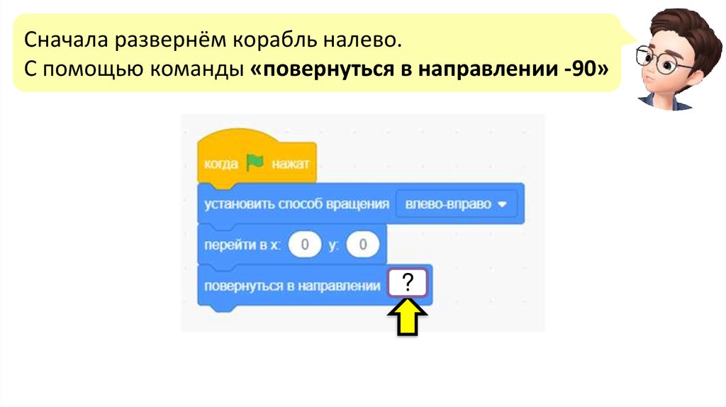 Теперь развернём корабль вправо.С помощью команды «повернуться в направлении»