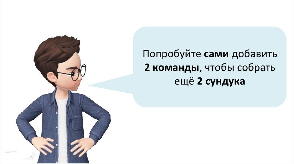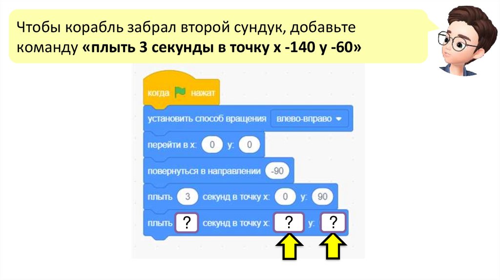 Чтобы корабль забрал второй сундук, добавьтекоманду «плыть 3 секунды в точку х -140 у -60»