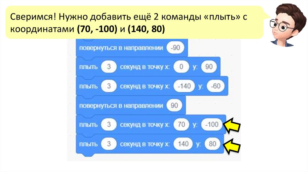 Сверимся! Нужно добавить ещё 2 команды «плыть» скоординатами (70, -100) и (140, 80)