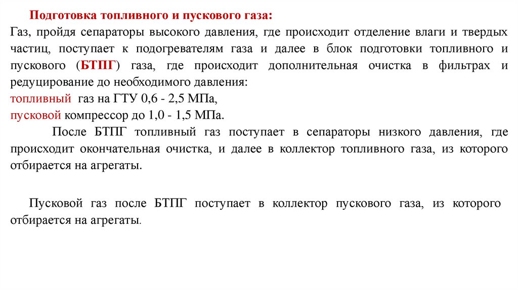 Подготовка топливного и пускового газа:Газ, пройдя сепараторы высокого давления, где происходит отделение влаги и твердых