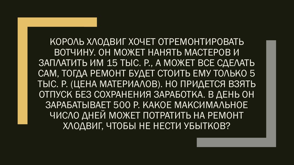 1. Король Хлодвиг хочет отремонтировать вотчину. Он может нанять мастеров и заплатить им 15 тыс. р., а может все сделать сам,