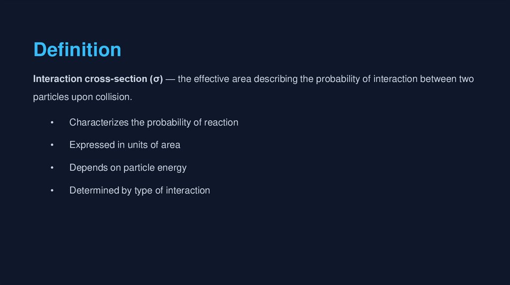 DefinitionInteraction cross-section (σ) — the effective area describing the probability of interaction between two