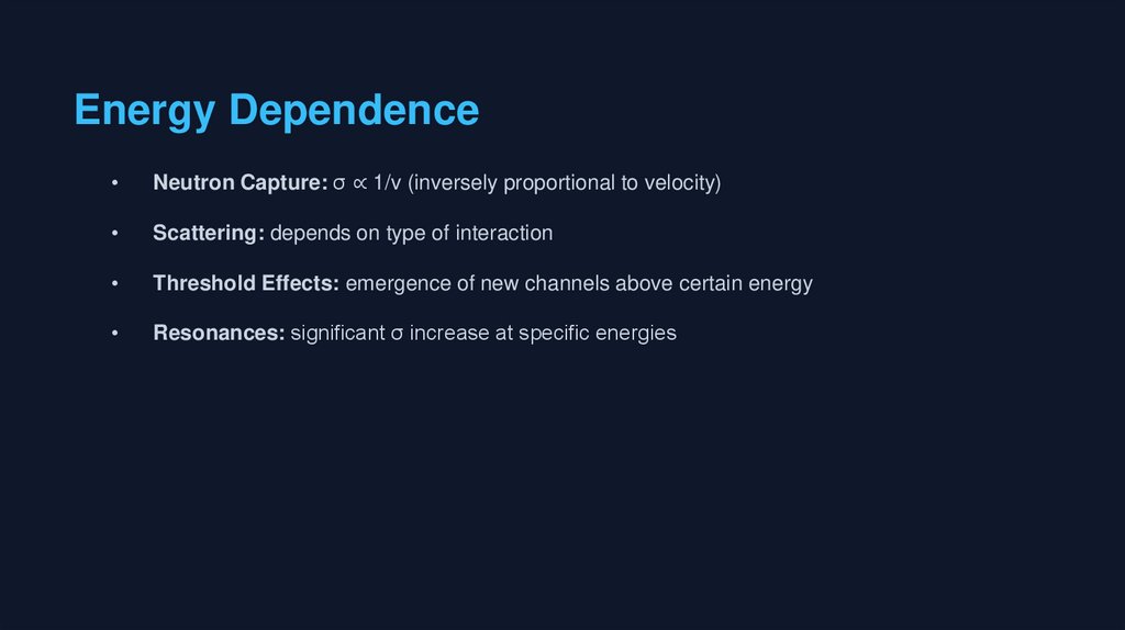 Energy DependenceNeutron Capture: σ ∝ 1/v (inversely proportional to velocity)
