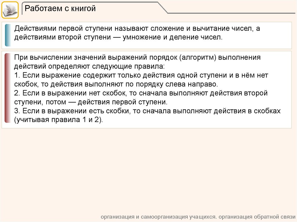 Работаем с книгойДействиями первой ступени называют сложение и вычитание чисел, а