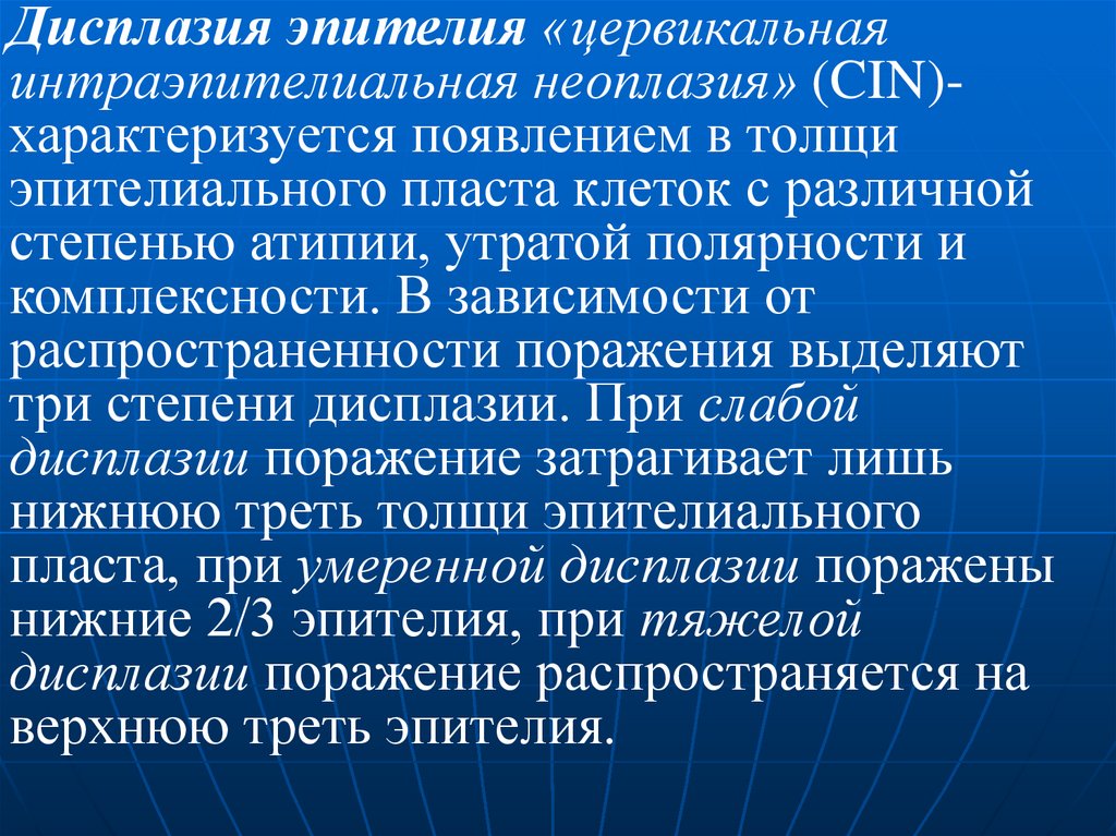 Дисплазия эпителия «цервикальнаяинтраэпителиальная неоплазия» (CIN)характеризуется появлением в толщи